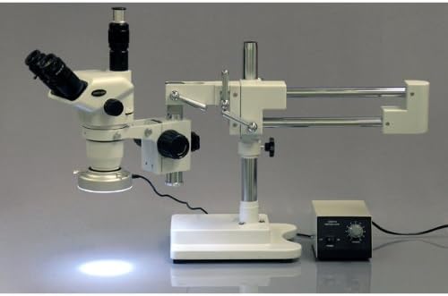 The AmScope ZM-4TNV3 professional trinocular stereo zoom microscope has a pair of 10x and 20x extreme-widefield focusing high-eyepoint eyepieces, a 0.67x-4.5x zoom objective, two Barlow lenses, and a double-arm boom stand. The microscope has an overall magnification range of 2x-180x. The trinocular viewing head has an interpupillary range of 55 to 75mm, a 45-degree inclination to reduce eye and neck strain, and 360-degree rotation to enable sharing. The vertical trinocular port can be used as a C-Mount or 23mm photo port (camera sold separately). The EW10x22mm and EW20x12mm extreme-widefield focusing high-eyepoint eyepieces combine with the 0.67x-4.5x zoom objective to provide zoom magnification and a longer working distance for inspecting large-scale specimens that require handling or repair. The microscope comes with 0.3x and 2.0x Barlow lenses that can be added to the objective to increase the magnification range. A Barlow lens with a magnification of less than 1.0 reduces magnification and increases the working distance, while a Barlow lens with a magnification greater than 1.0 increases the magnification and reduces the working distance. Focusing eyepieces provide fine focus, high-eyepoint eyepieces ease viewing for users who wear glasses, and dioptric adjustment accommodates individual eye-strength differences. A stereo microscope, sometimes called an inspection or dissection microscope, has low magnification and a long working distance that enables users to manipulate the object being inspected. Ambient lighting illuminates the specimen, eliminating the need for power or batteries. The microscope has a double-arm boom stand that enables users to position the microscope head on all three axes (X, Y, and Z). The stand has 20" double arms, and a 30" overall length. Bilateral focus eases use for left- and right-handed users. The pillar is 17" and the focus rack has a 3" diameter. The solid cast-steel base is 2 x 8-1/4 x 10-1/4 inches (H x W x D, where H is height, the vertical distance from the lowest to highest point; W is width, the horizontal distance from left to right; D is depth, the horizontal distance from front to back).SpecificationsHeadTrinocularMagnification range2x-180xZoom objective power0.67x-4.5xEyepieces (DIN, 30mm)EW10x22mm and EW20x12mm focusing high-eyepointOptical working distanceUp to 14"Microscope standDouble-arm boom standHead movementX-, Y-, and Z-axesIllumination typeN/ALight sourceAmbientPowerN/AMicroscopes are instruments used to enhance the resolution of an object or image. Types include compound, stereo, or digital. Compound microscopes use a compound optical system with an objective lens and an eyepiece. Stereo microscopes show object depth in a three-dimensional image. Digital microscopes are used to display an image on a monitor, rather than looking through a lens. Microscopes can have monocular (one), binocular (two), or trinocular (three) eyepieces, with varying magnification abilities. Magnification ability refers to the size of an image. Resolution, also known as resolvant power, refers to the clarity of the image. The interaction between field of view (FOV), numerical aperture (NA), and working distance (WD) determines resolution. Microscopes can control magnification through a fixed focus, or through a range of adjustments. They can also utilize LED, fluorescent, and mirror light sources to help control viewing capabilities. Microscopes are widely used in education, lab research, biology, metallurgy, engineering, chemistry, manufacturing, and in the medical, forensic science, and veterinary industries.United Scope manufactures microscopy equipment and accessories under the brand name AmScope. The company, founded in 1996, is headquartered in Irvine, CA.What's in the Box?AmScope ZM-4TNV3 stereo zoom microscope with double-arm boom standEW10x22mm focusing eyepieces, 30mm, one pairEW20x12mm focusing eyepieces, 30mm, one pair0.67x-4.5x zoom objective0.3x Barlow lens2.0x Barlow lensFocus rackEye guards, one pairStage clips, one pair