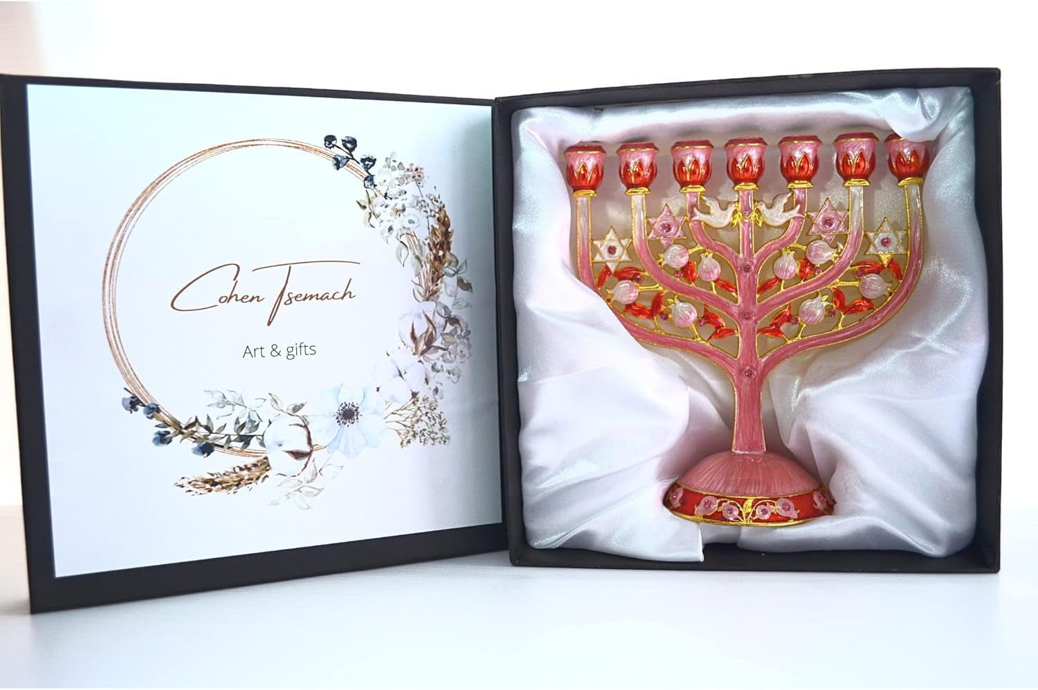 Cohen Tsemach Art & Gift 7 Branch Menorah Candle Holder Crystal Rhinestones Bejeweled Hand-Painted Star of David Enamel Candlesticks Motifs of pomegranates and doves Cohen Tsemach Art & Gift Hand Painted Enamel Menorah Star of David Pink The menorah is a seven Branch This piece is crafted from hand painted pewter. Each one is kiln fired to ensure the enamels long lasting quality. We then embellish each one with Gold accents and hand set Crystals. This Menorah comes secured in a luxury gift ready box. With a Turquoise color motif and a Star of David pomegranates and doves, the 7 branches stand majestically united. The perfect gift for a spiritual someone in your life as a decoration or religious symbol! Height :6.5 inches Width :6.5 inches JUDAICA: The Star of David motif carved candelabra, was one of the ancient and traditional symbol of JUIDAICA and Jewish culture. OCCASION: This seven branched candelabra is Perfect for Tabernacle,Shabbat,Christmas,ceremony,Christian prayer corner,Congregational church DISPLAY: This Menorah candle stick is a perfect embellishment to display on altar,shelf inside a cabinet,fireplace mantel,sideboard,prayer table or desk centerpiece. GIFT: The traditional and Biblical Jewish Menorah makes a perfect Holy Land Judaic present to Jewish friend elder people or other religious people.