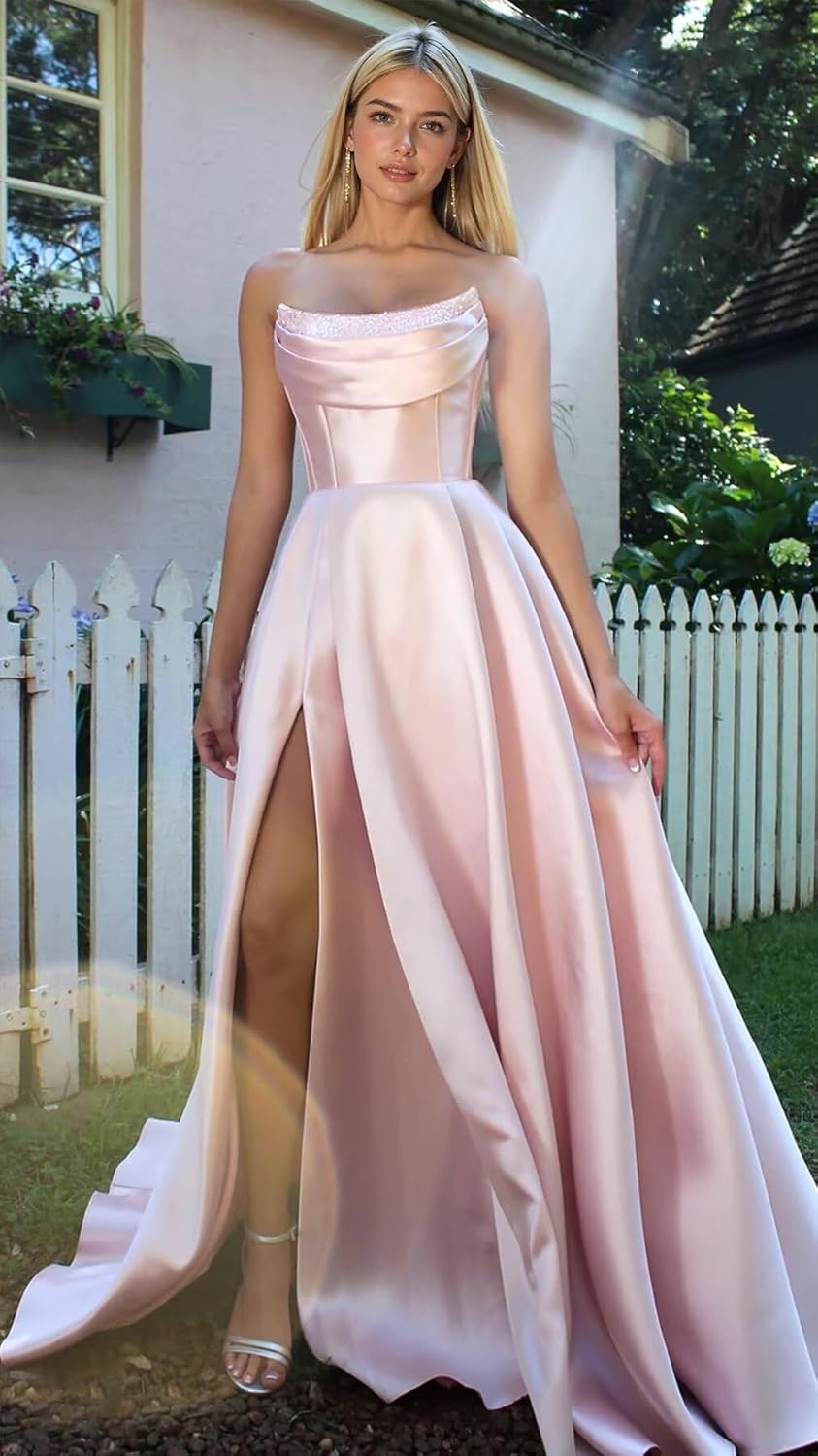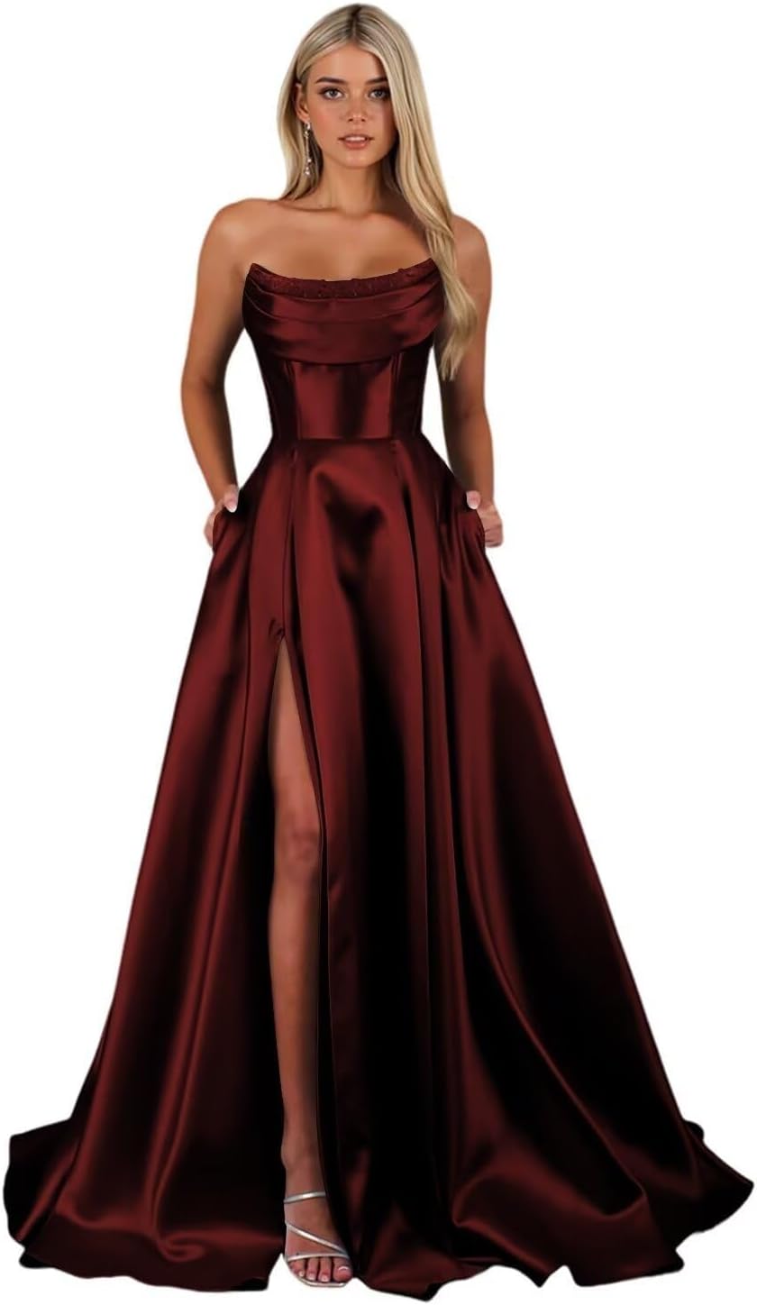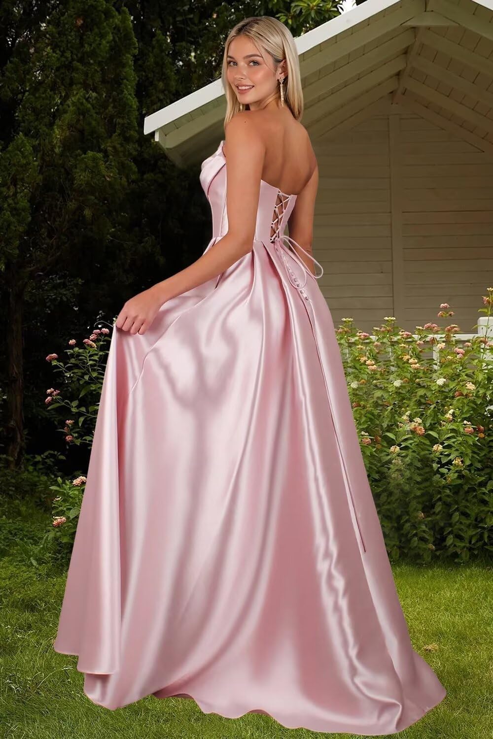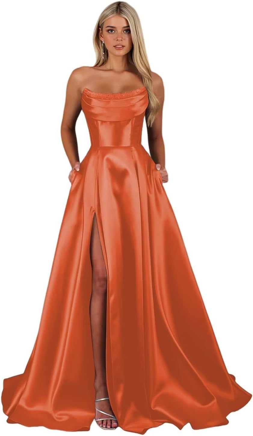 | Fabric Type | Long Satin Strapless Corset Slit A Line Prom Dresses with Pockets |