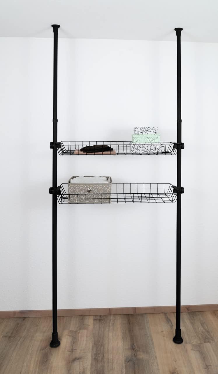 Design your walk-in wardrobe based on your wishes with the Herkules telescopic system by WENKO in black. The elements of the adjustable system can be individually adapted to a wide variety of rooms. The practical Herkules storage system is a true all-rounder that you can put together according to your needs. Whether as a coat rack in the hallway, wardrobe in the bedroom or walk-in wardrobe – the telescopic storage system offers a lot of space and storage for clothes, shoes and accessories. To complement the Herkules telescopic system, there is the matching Herkules basket, which comes directly in a practical set of 2 for even more storage space. The spacious baskets are made of sturdy steel and can be attached between two vertical main bars of the Herkules system. The basket in trendy black wire design can be attached in no time at all and without drilling using plastic brackets, which are included in the scope of delivery. Without the brackets, the basket measures (W x H x D): 83 x 8 x 38 cm and can support a maximum load of 15 kg. Including the holders, the basket is 94 cm wide. Not all items of clothing are hung on hangers; some are stored folded, for which the generous wire basket is perfectly suited. Alternatively, selected boxes for small items (such as socks or belts) that match your furnishings can be placed here to give the storage system a personal touch. Fulfil your dream of a walk-in wardrobe with the Herkules telescopic storage system from WENKO and choose the accessories that suit you best. Do you prefer a lighter interior design style? The Herkules telescopic system is also available in white with light grey brackets. Material: Basket: Steel, Plastic parts: Plastic (ABS), Non-Slip Parts of the plastic parts: PolypropyleneColour: Basket: Black, Plastic parts: Black, Non-Slip Parts of the plastic parts: BlackDimensions L/H/W: 94 cm x 8 cm x 38 cmNet weight: 1500 g